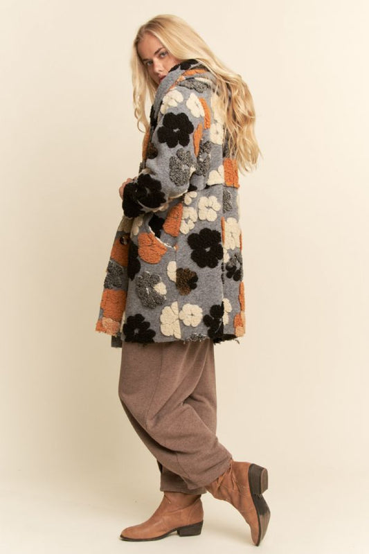Ladies Chunky Flower Embroidered Hoodie Coat-Gray