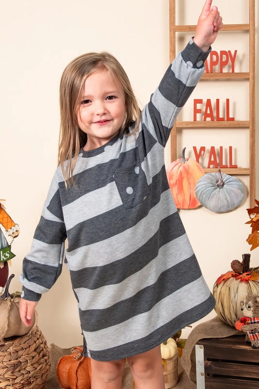 Girls 12PM Striped Knit Contrast Dress With Polka Dot Pocket and Long Sleeves