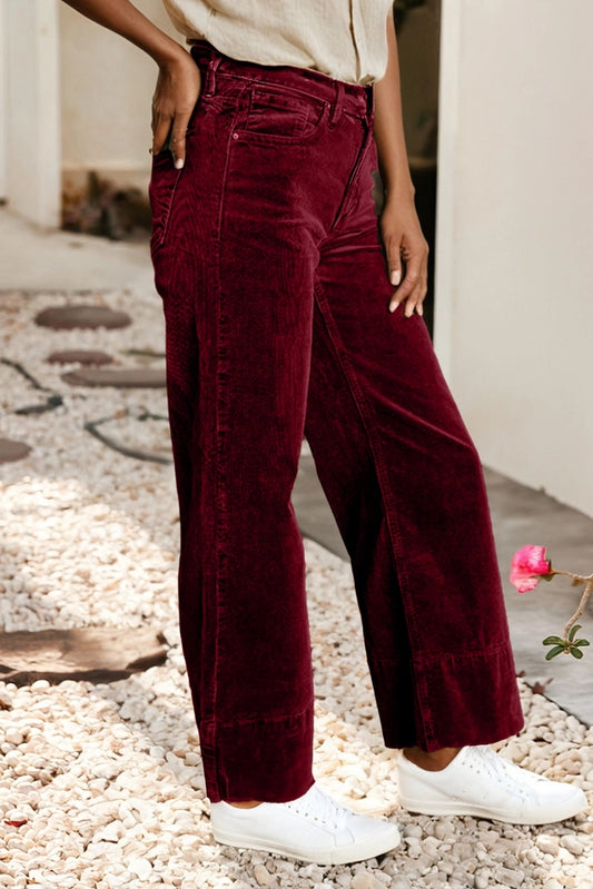 Ladies Solid Color High Waist Corduroy Wide Leg Pants-Burgundy