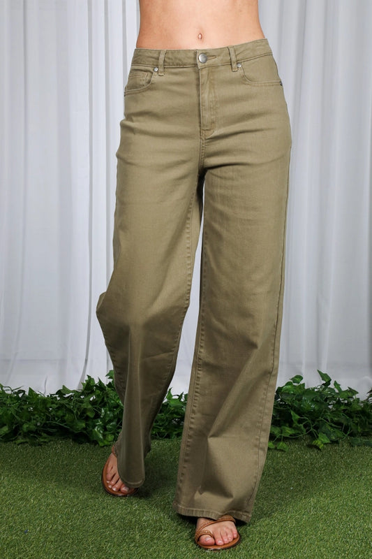 Ladies Wide & Loose Straight Leg Cotton Span Long Pants-Olive