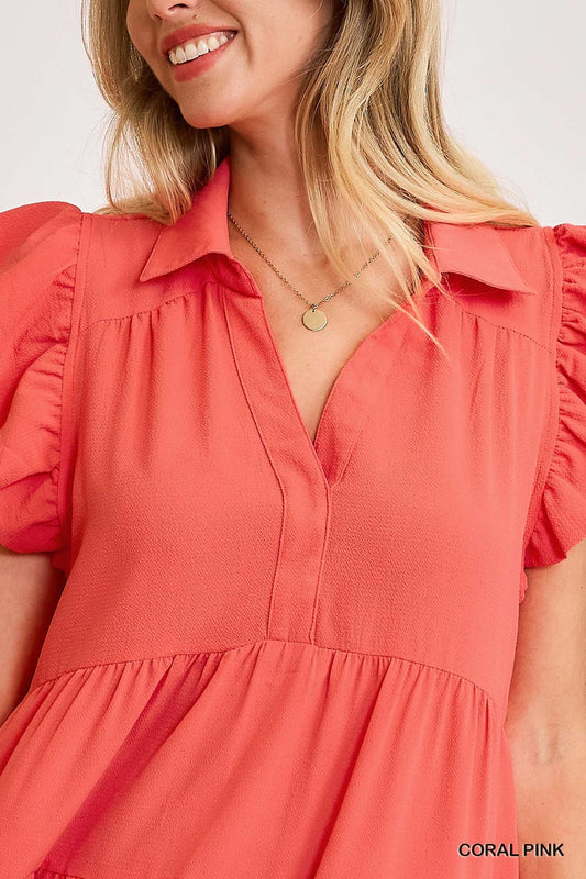 Ladies Ruffle Sleeve Tiered Dress by Umgee - Coral Pink