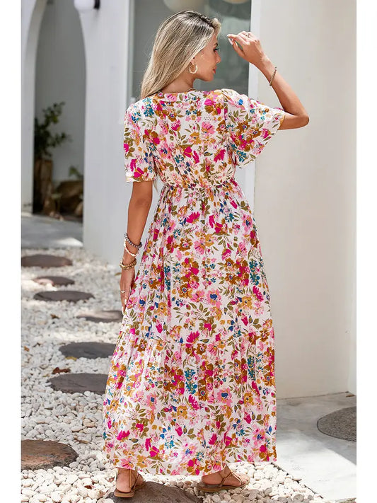 Ladies LDC Floral Short Sleeve V Neck High Waist Maxi Dress-Red