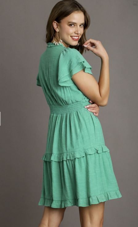 Ladies Short Sleeved V-Neck Ruffle Detailed Dress by Umgee - Emerald