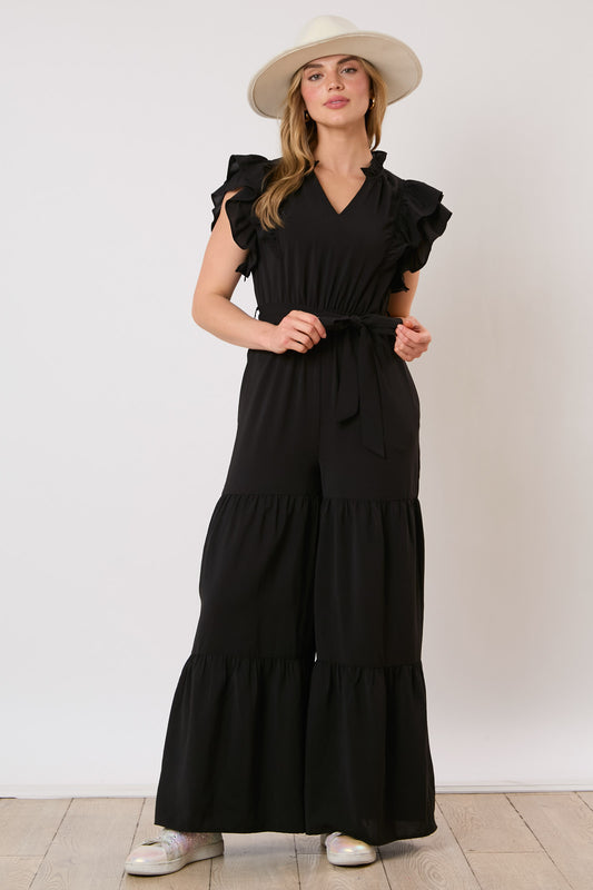 Ladies Airflow Woven Jumpsuit with Shoulder Ruffles and Ribbon Belt by Peach Love CA