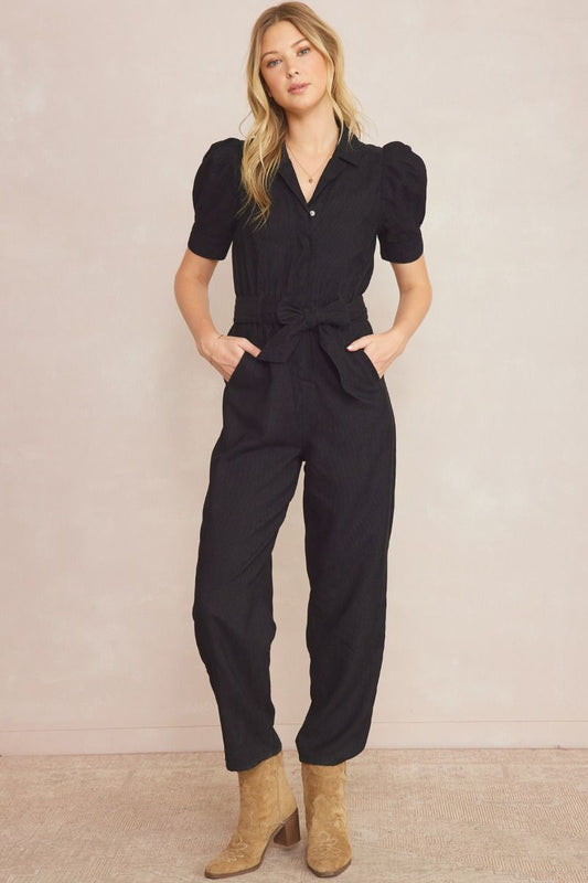 Ladies Corduroy Puff Sleeve Button-Down Jump Suit By Entro- Black