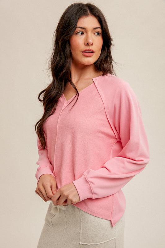 Ladies Hem & Thread V-Neck Asymmetrical Hem Loose Fit Sweatshirt-Pink