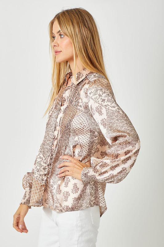Ladies Mystree Pintuck Print Blouse - Sand Mix