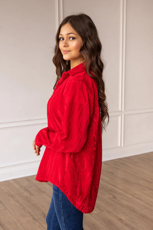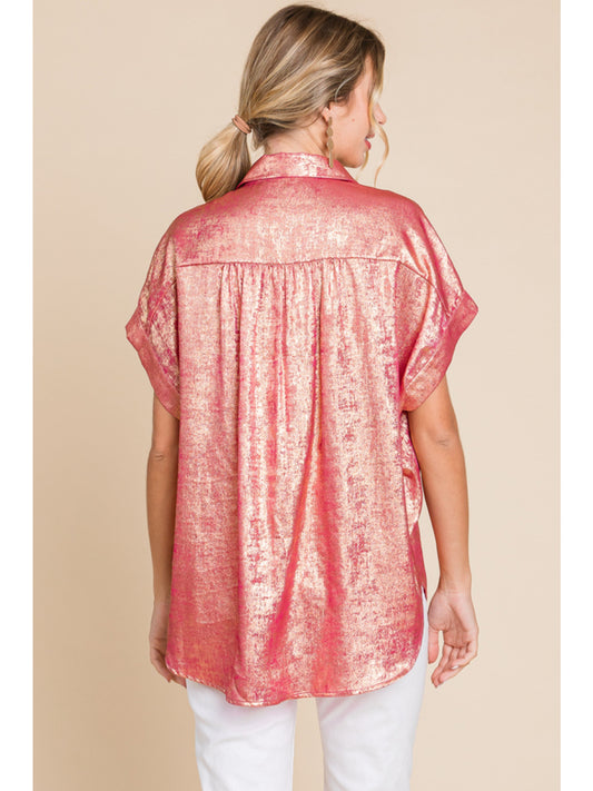 Ladies Jodifl Metallic Collared Button Up Top With Cuffed Short Sleeves and Ruched Shoulders