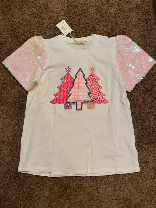 Ladies Grace & Emma Sequin Christmas Trees on White Sequin Sleeve Top