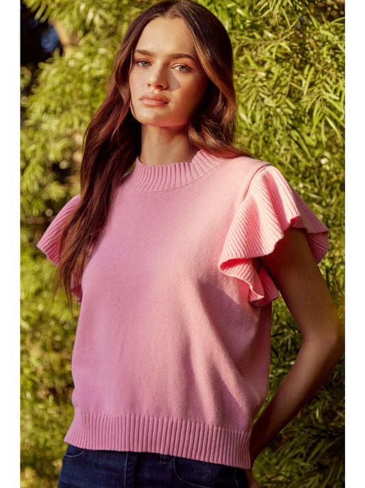 Ladies Jodifl Solid Knit Top With Crew Neck, Ruffled Shoulder, and Ribbed Hemline-Bubble Gum Pink