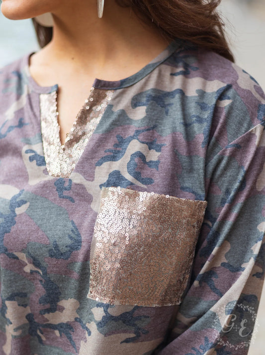 Ladies Grace & Emma Welcome to the Jungle Sequin Notch Long Sleeve Top With Pocket, Camouflage