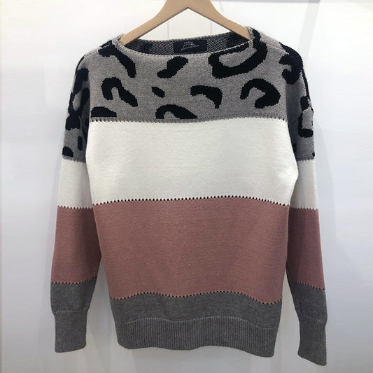 Ladies Color-Matching Leopard Print Crew Neck Sweater-Pink