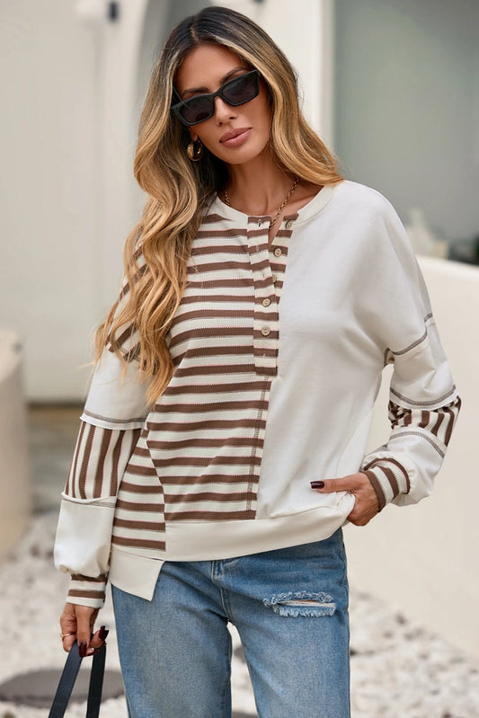 Ladies Stripe Stitched Detail Patchwork Oversized Pullover Top-Khaki
