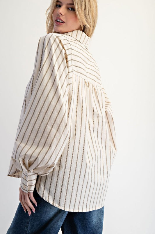 Ladies Easel Striped Button-Down Woven Shirt-Khaki