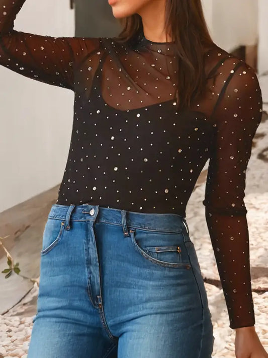 Ladies LDC Rhinestone Sheer Mesh Slim Fit Long Sleeve Top-Black