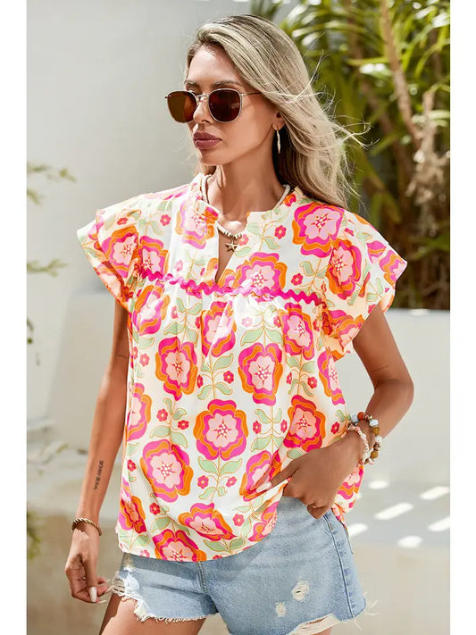 Ladies LDC Boho Floral Print Ricrac Ruffle Sleeve Blouse-Rose