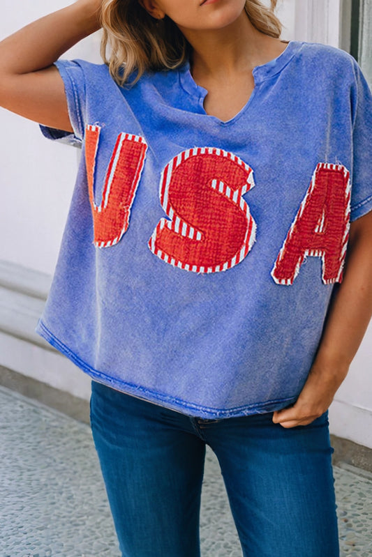 Ladies LDC USA Patch Mineral Wash Notch V Neck Loose T Shirt