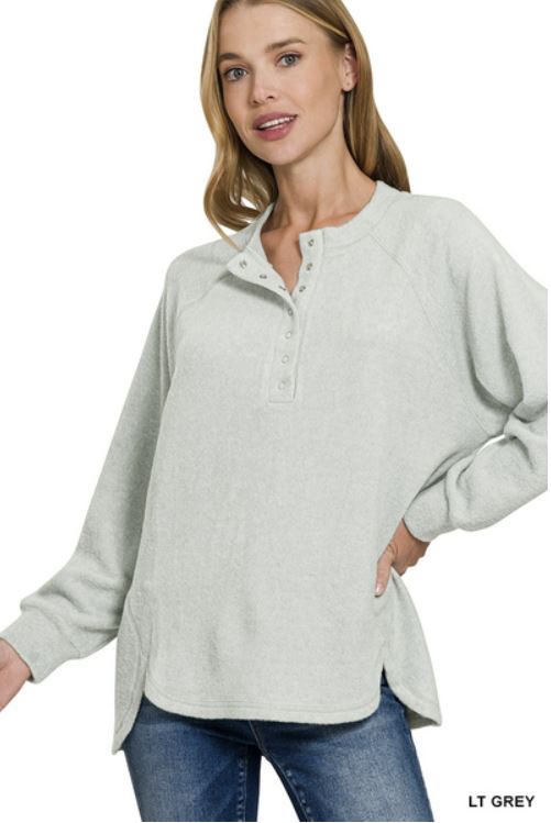 Ladies Zenana Brushed Melange Hacci Oversized 7-Button Henley Placket Sweater-Light Grey