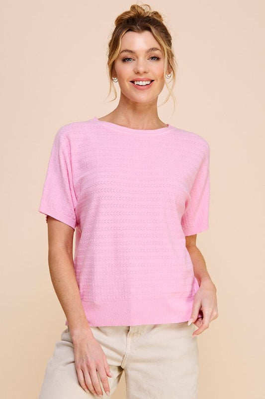 Ladies Soft Fine Gauge Pointelle Short Sleeve Top by Allie Rose - Ballet Pink
