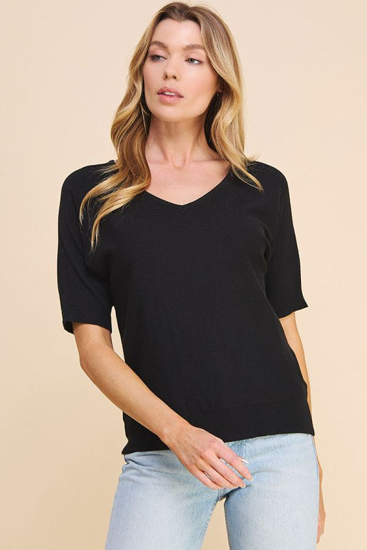 Ladies Soft Fine Gauge Short sleeve Dolman Top with Pointelle V-Neck by Allie Rose - Black