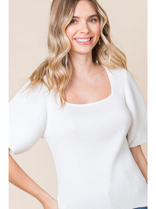 Ladies Jodifl Ribbed Top With Square Neck and Puffed Sleeves-White