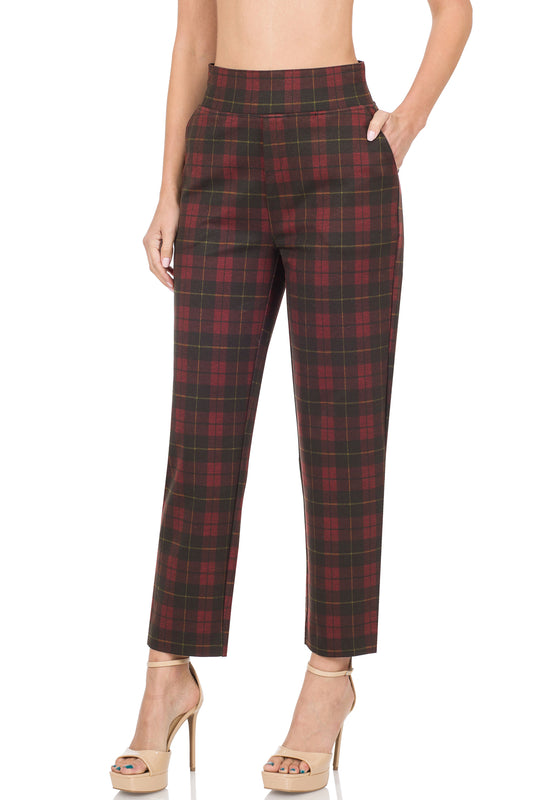 Ladies Zenana Plaid Pull-On Stretch Dress Pants-Burgundy