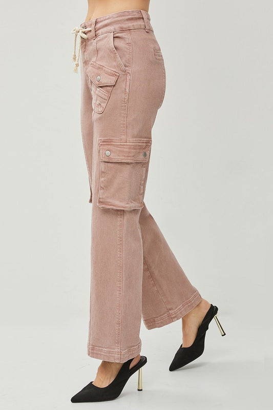 Ladies High Rise Cargo Straight Pants by Risen Jeans-Mauve