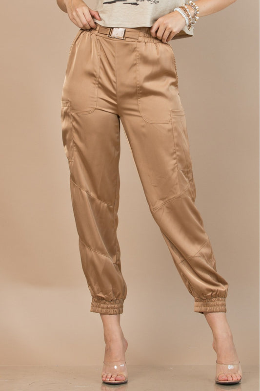Ladies Satin Belted Cargo Pockets Pants by NYLON Apparel-Champagne