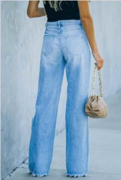 Ladies Mid-Rise Ripped Wide Leg Jeans-Lt Blue