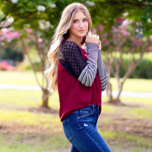 Ladies Top with Lace and Stripes Sleeves