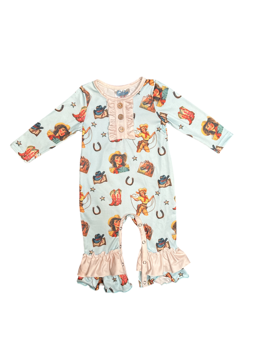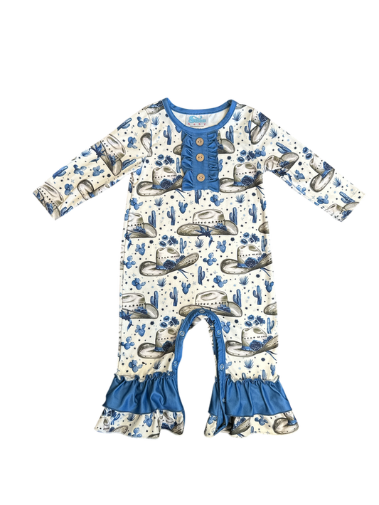 Girls Blue Vintage Cowgirl Long Sleeve Romper by Shea Baby