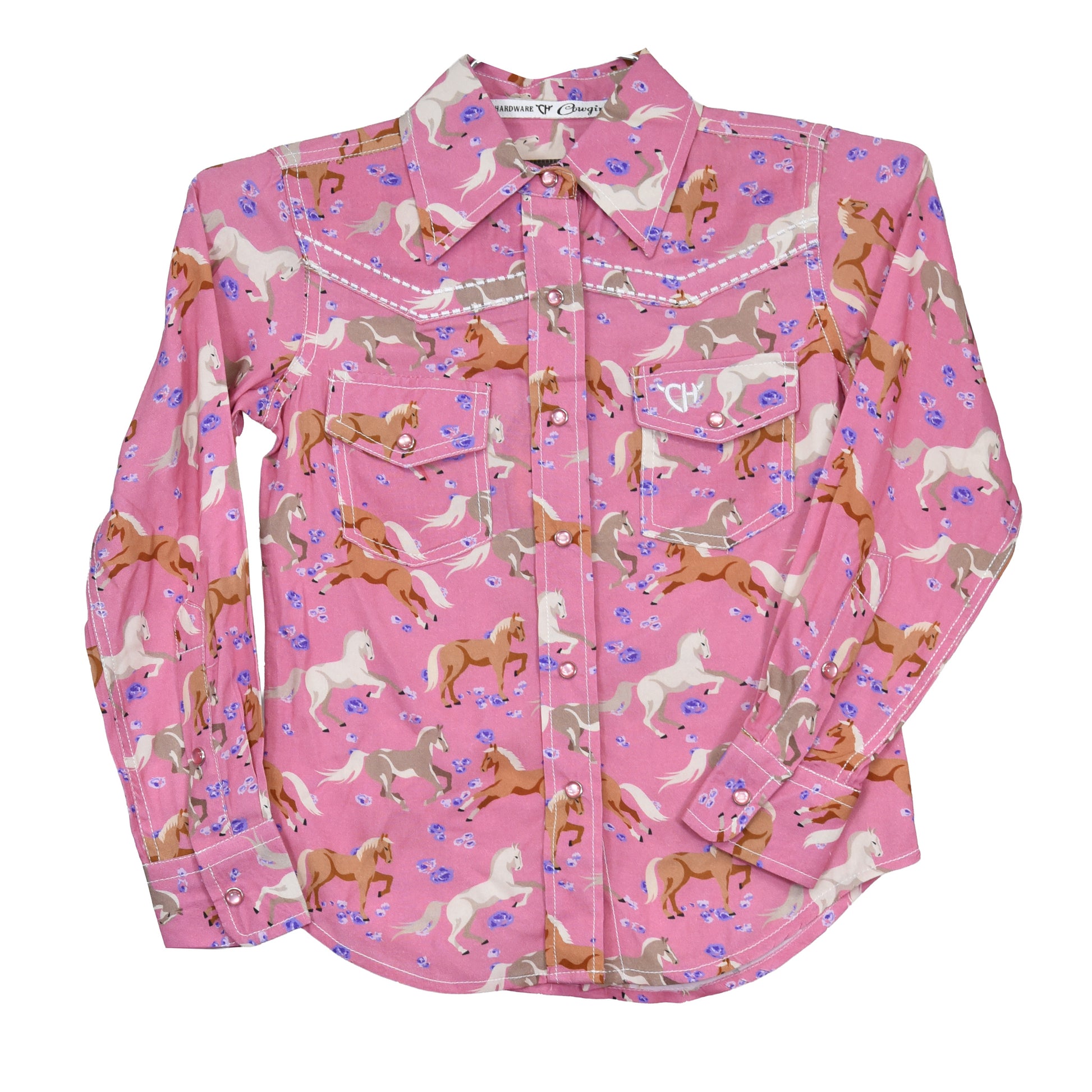 Girls Pink Horse Flowers L/S Print Shirt by Cowboy Hardware