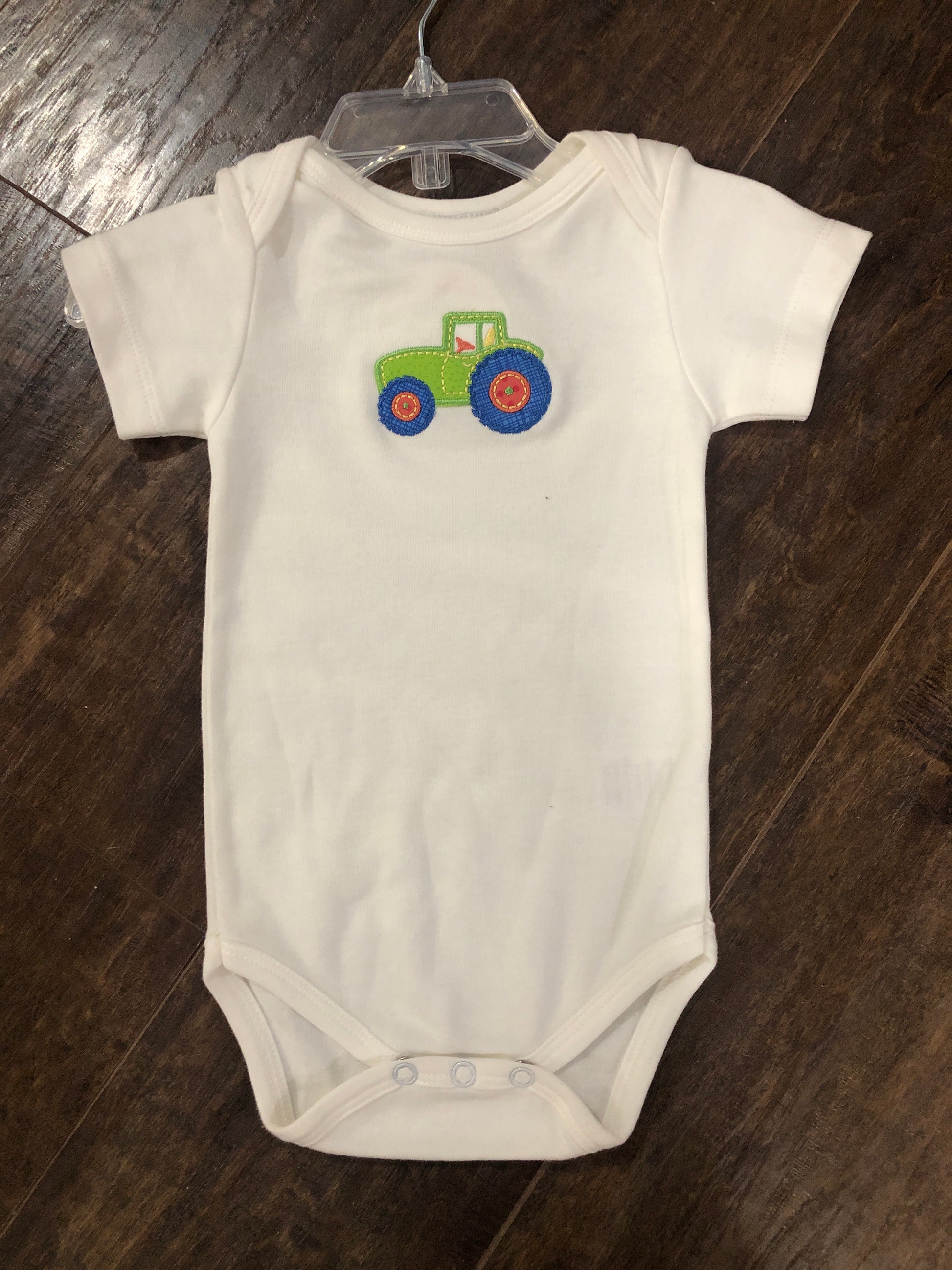 White Onesie with tractor applique, fire truck applique or cowboy boot applique