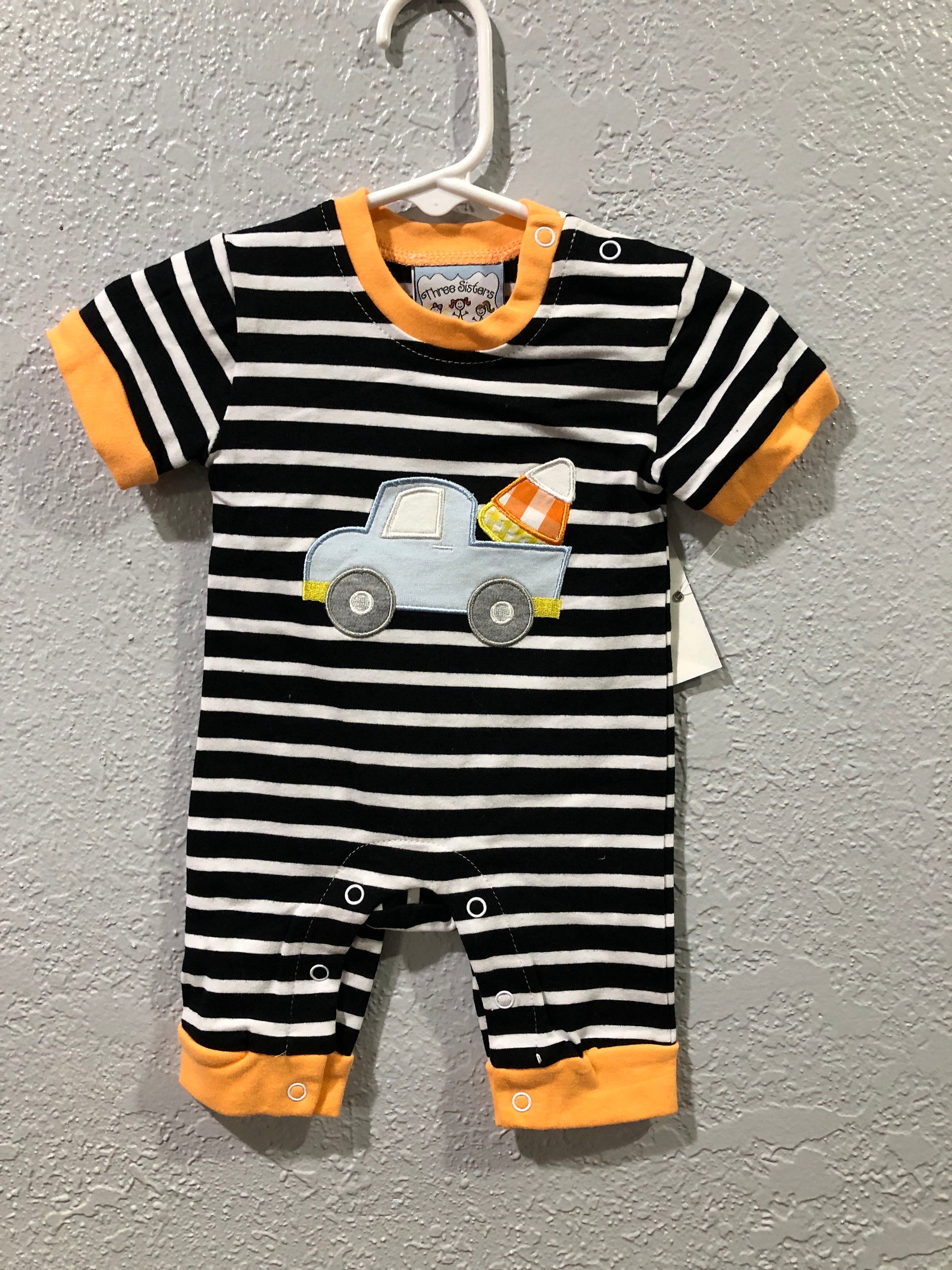 Boys Truck w/Candy Corn Stripe Romper by Three Sisters