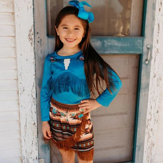 Girls Blue Steer Head Fringe Tee by Shea Baby