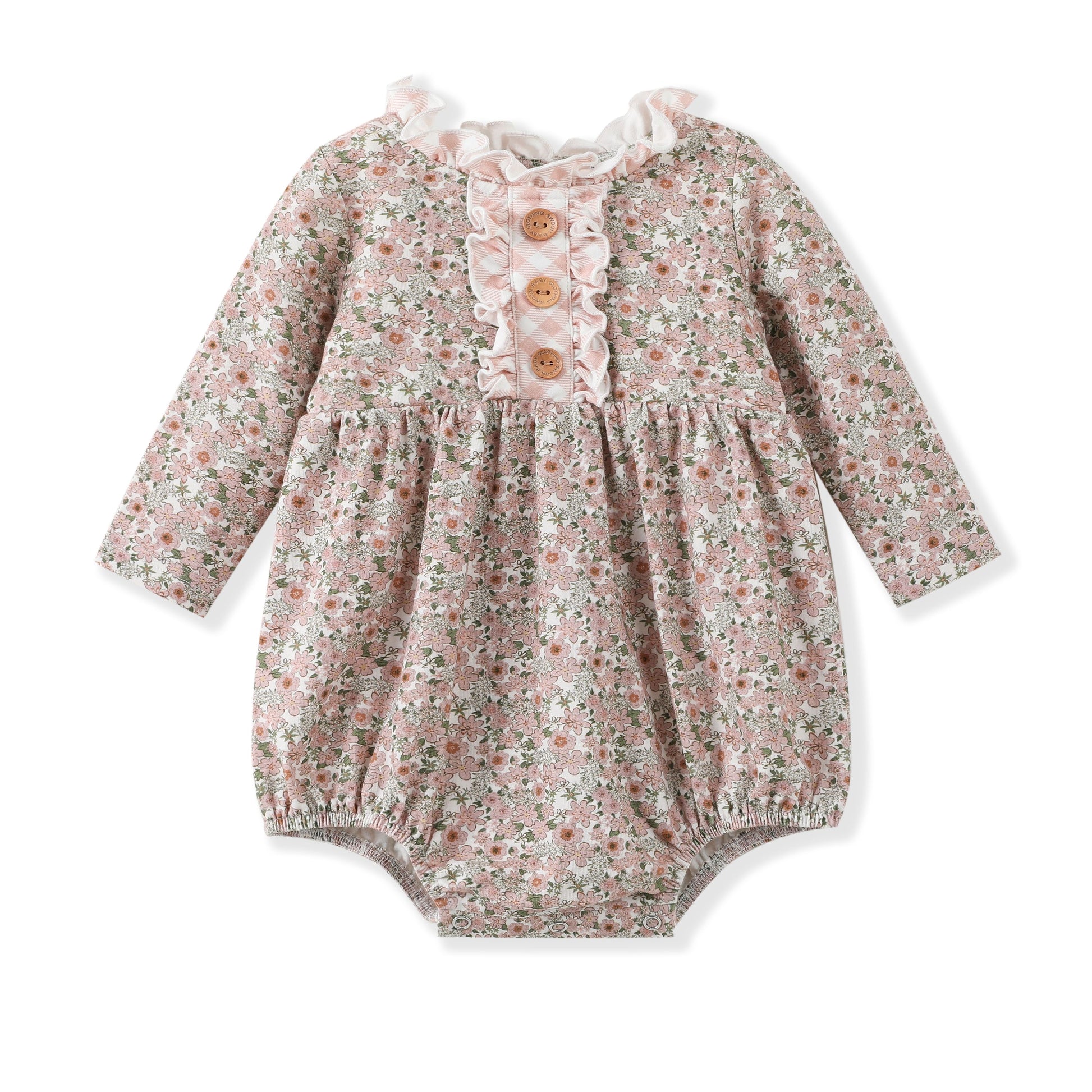 Cream and pink floral romper with ruffle at neck and placket. Snaps make changing diaper so easy.