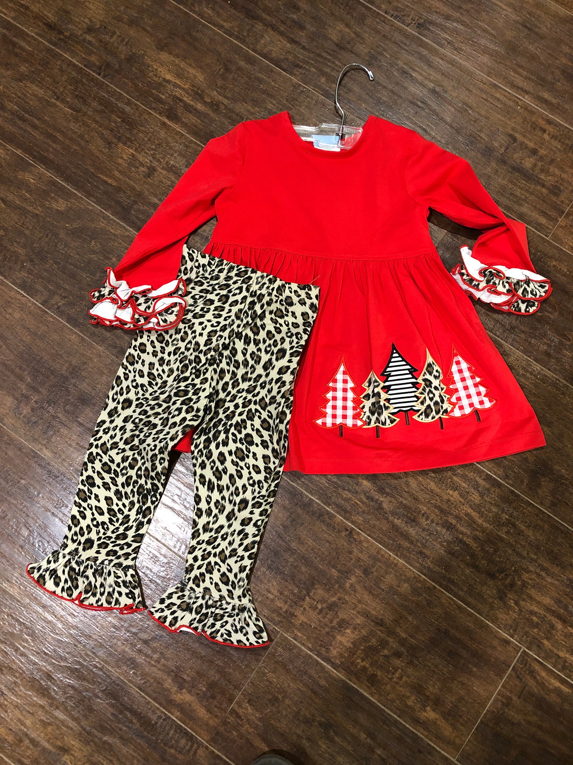 Red with trees applique bloomer set or legging set. Accented with leopard trim and leopard bloomers and leggings.