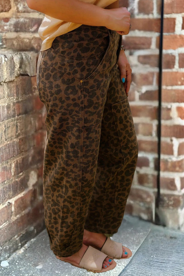 Leopard print with clear seam patchwork adds a trendy, edgy touch. Straight-leg silhouette offers a comfortable, flattering fit.