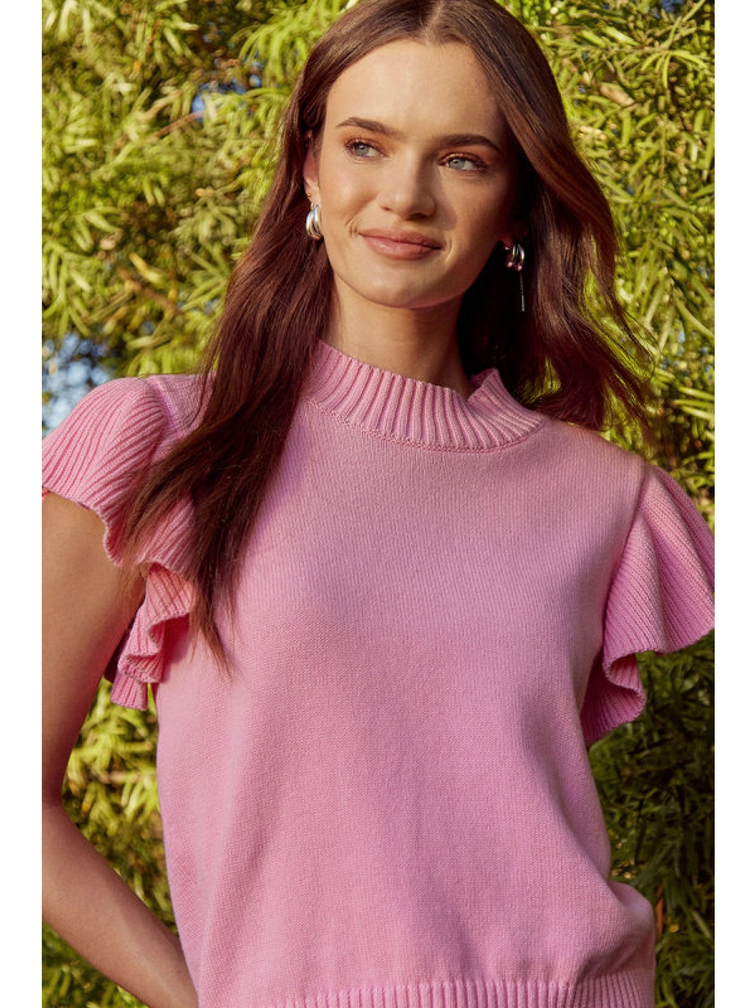 Ladies Jodifl Solid Knit Top With Crew Neck, Ruffled Shoulder, and Ribbed Hemline-Bubble Gum Pink