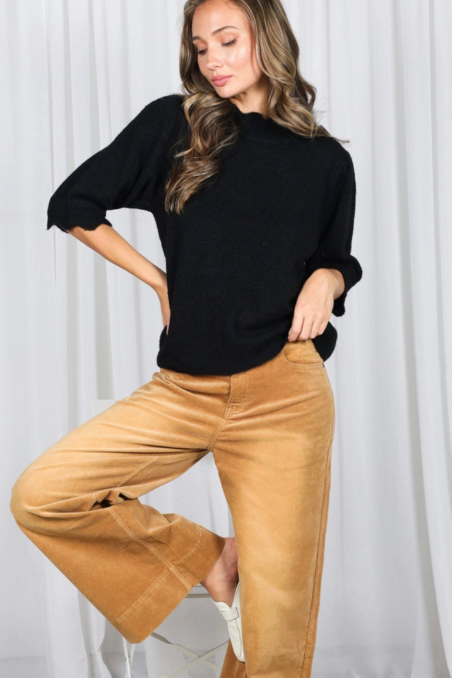 Ladies Scalloped Edge Detailing Soft Cozy Sweater-Black